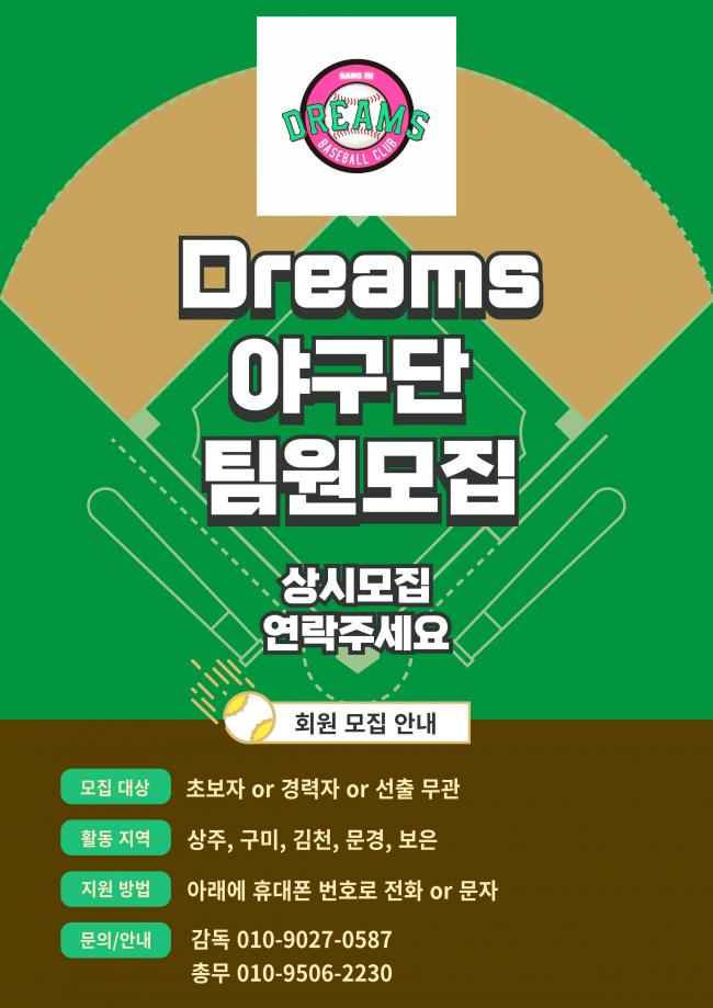 상주시 사회인야구팀 상주드림스 야구단 입니다. 함께 야구하실 가족을 모집하고 있습니다. 매주 수요일 연습을 진행하고 있습니다. 실력이 걱정이신 분들은 연습으로 실력을 키울 수 있는 기회라고 생각합니다. 매주 일요일 상주 낙동 야구장(인조잔디 구장)에서 경기 합니다. 초보, 경력 모두 환영합니다. 현재 2~30대 회원이 주이지만 나이에 상관없이 환영합니다. 팀 분위기도 정말 분위기가 좋습니다. 즐겁게 야구하실분들 많은 지원바랍니다(문경, 의성 ,구미, 김천, 모두 약 30분거리). |